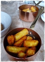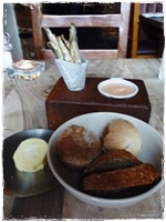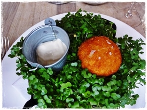 I chose two of Tom’s dishes from The Great British Menu: the Crayfish Scotch Egg with Garlic Mayo and the Slow-Cooked Duck Breast with Duck Fat Chips and Gravy. My husband had Salmon Tartare with Salt and Pepper Bread and followed with my choice of Duck Breast. Because we ordered à la carte we were offered complimentary canapés which consisted of homemade bread and cutely quirky fried whitebait presented in a paper cone and served with a traditional Mary Rose Sauce. Shades of the seaside; lovely and tasty. A very nice touch. These were consumed with the first of several bottles of PURE sparkling water in reusable bottles and a tasty Bellini cocktail from the drinks list.