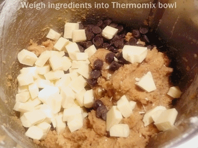 - Weigh all the ingredients except the oats and chocolate chips into the Thermomix bowl. Mix 30 seconds, gradually increasing from Speed 3 to Speed 5.