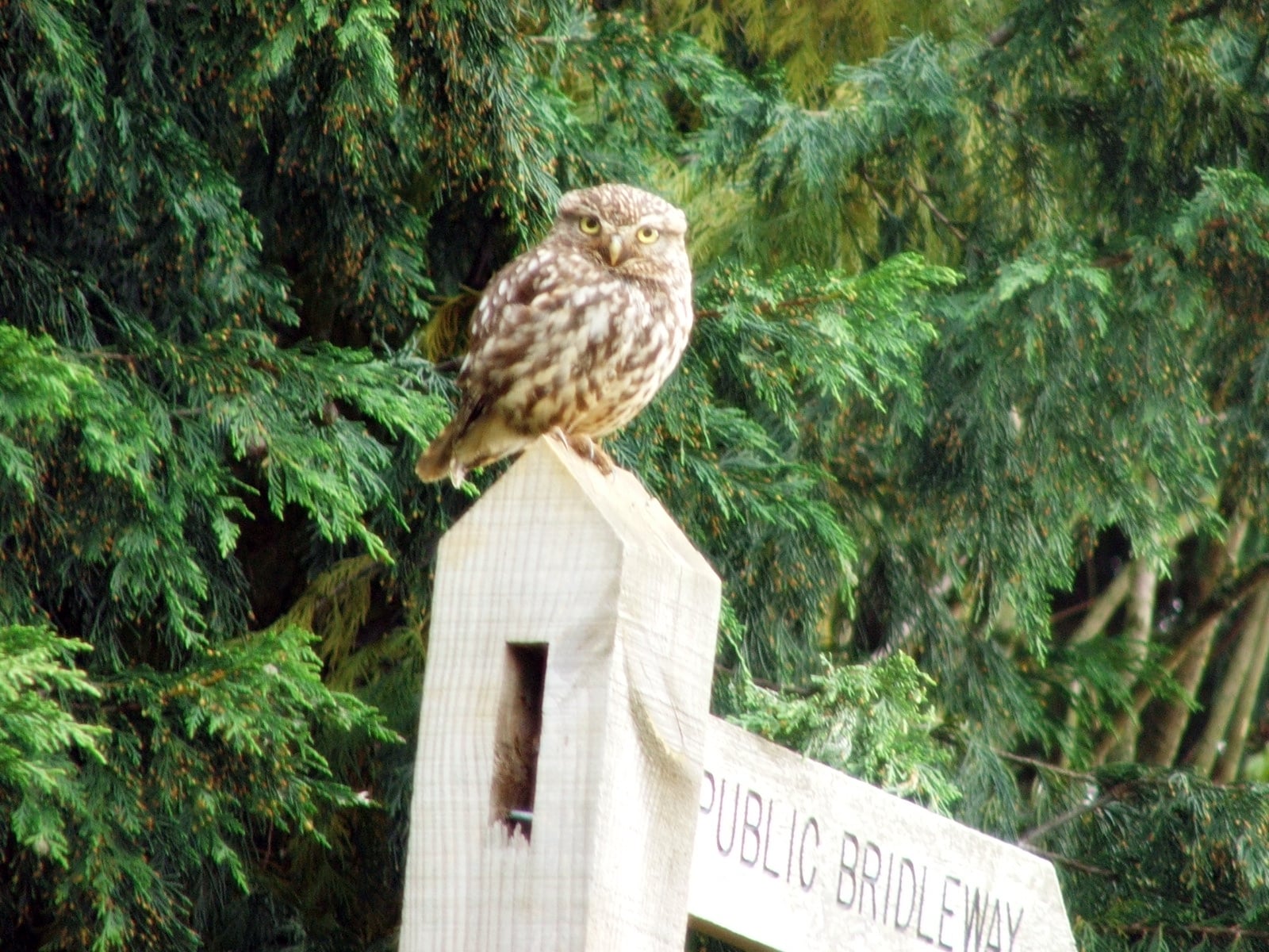 A Little Owl Perches Atop a Public Bridleway Sign in Surrey