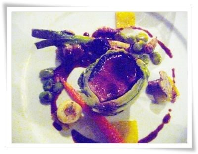 Cannon of lamb wrapped in cabbage, candied beetroot, pied bleu mushrooms, rosemary jus with broad beans, leek, carrot, baby turnip, Alsatian crosnes and yellow beetroot