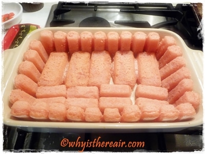 A traditional Charlotte is made in a slant-sided Charlotte mould and unmolded before serving. For ease in serving 50 portions I have used a medium-sized rectangular dish and did not unmold.
