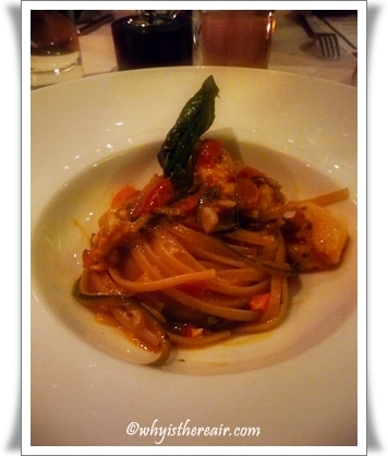 Just a hint of tomato and herbs holding together the perfectly-cooked linguine didn’t overpower the fresh lobster and langoustine. The thin strips of courgette “linguine” provided a different texture in this dish. Served with a glass of Venezia Giulia Sauvignon 2009