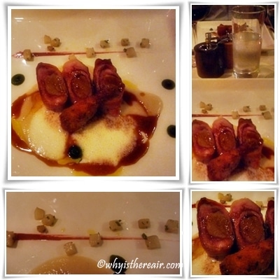 The best dish of the evening. Layer upon layer of flavours intermingled to delight our taste buds. Subtle hints of sage and breadcrumbs in the stuffing set off by the smoked ham surrounding the boneless quail. Amazing depth of flavours in the gravy / sauce / reduction. Comforting, trendy and supremely delicious. Served with a glass of powerful and spicy Aglianico