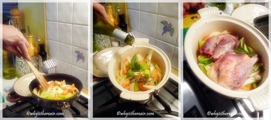 - Prepare a mirepoix by dicing carrot, onion and celery. Sauté in olive oil and transfer to a fireproof casserole dish.