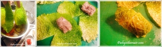 - Divide this sausage mixture in two and place on the blanched cabbage leaves. Roll into bundles.