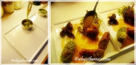 - Make a bed of Savoy cabbage and lardon mixture on your two warm plates. Use a ring if you have one to make a nice, neat bed. Remove the braising legs from the oven and place on top of the cabbage bed.