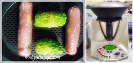 - Now carefully open the lid of the Varoma steamer and add the stuffed cabbage leaves, seam side down, to the top tray along with the roulades. There still should be about 10 minutes of the original steaming time left which will finish the roulades and cook the cabbage bundles without overcooking the leaves. When your Thermomix sings to you, turn it off, remove the Varoma steamer and place it on a plate to keep warm.