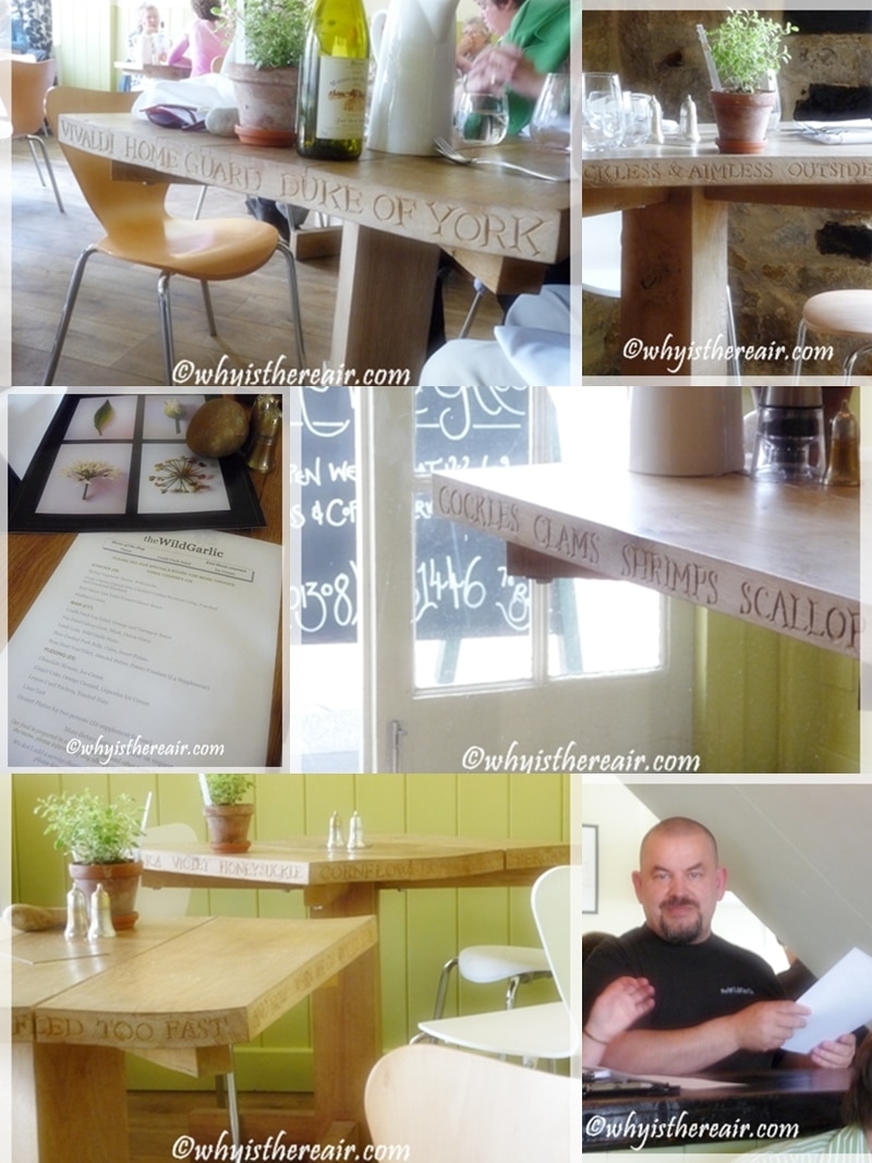 Ah, yes; speaking of surroundings, just what is the link between Vivaldi, Home Guard and Duke of York? They’re all varieties of potato! Each of Mat’s fascinatingly rustic and beautiful tables is carved around the edges with varieties of vegetable, of fish, or of birds; another one has odd sayings on it that I have to admit go beyond my comprehension of English culture.