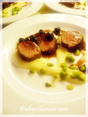 The highlight of our meal was the slow-cooked filet mignon of venison with its superb Visciole a mollo cherry sauce. Absolutely smashing! Visciole a mollo cherries are small, tart cherries from the Le Marche region of Italy, and I had a jar of them in syrup. [Note to Supercherry UK: get the boys in Italy to remove the stones!] To make my sauce I reduced some chicken stock in the Thermomix on Varoma setting, added shallot, garlic and the Visciole a mollo cherries with their syrup. A good dash of red wine later and a knob of butter and voilà ! A fantastic taste to enhance the venison.