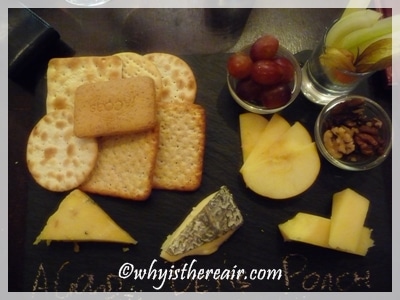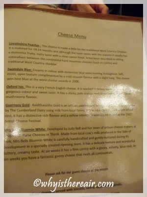 I have more of a savoury palate than a sweet one, so when it comes time to choose what to order after my main course I can easily be swayed by a proper cheese plate. At Green’s of Whitby there’s a whole menu of artisan cheeses from which to choose, selected and carefully ripened for Green’s by Cryer & Stott Cheese Mongers, Wakefield. My three cheeses were beautifully presented on a slate which made it simple to identify them with chalk. Fruit, nuts and biscuits/crackers rounded off this delightful end to my meal.