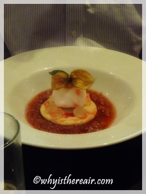 My husband John can easily be swayed by a sweet finish, so he chose the intriguing ginger beer sorbet, “posh” rhubarb crumble and ginger jelly. This turned out to be a very pretty creation of biscuit, hot rhubarb and cold sorbet. The rhubarb compote was a perfect balance of sweet and sharp and according to John it made the dish.