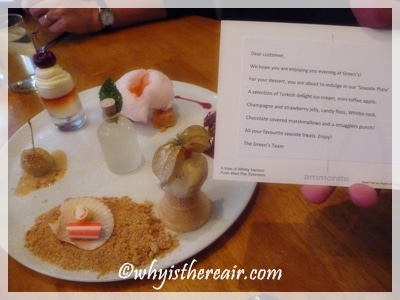 As we left the restaurant I spotted Green’s seaside plate (described as a great fun dessert with all the fun of the seaside on one plate), the quirky and imaginative dessert that John had last year. Being the cheeky thing I am, I requested and received permission to photograph another diner’s plate 😉