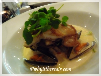 For his starter John chose the Catch of the Day, a very delicious fillet of Whitby brill with a little Whitby crab cake, a very tasty creamy crab sauce and a fabulous crispy deep-fried crab claw. I chose a starter portion of Thai style seafood broth with red curry, lemon grass and coriander, which John had had for his main course last year. It was just as good, presenting loads of just-cooked fresh seafood including mussels, tiger prawns, queen scallops and salmon along with leeks and kaffir lime leaves. The broth was nicely balanced with red curry paste and just the right amount of Thai fish sauce.
