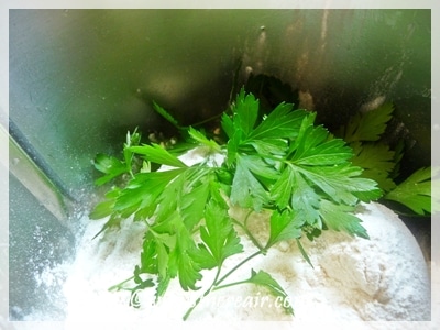 Variation: Chop some garlic and/or chillies into the flour before mixing. I had some homegrown parsley on hand and used this; cilantro/coriander would be delicious, too.