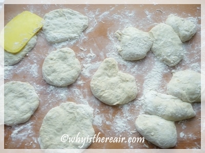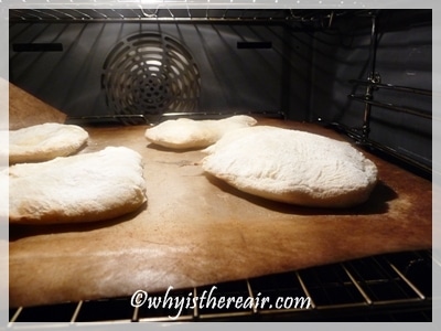 - Pre-heat your oven with a large baking sheet or pizza stone in it, to 230° C/450° F/Gas 8. Turn the raised dough out onto a well-floured board and divide into 8 pieces. (Your stiff Thermomix spatula blade works well for this – thanks, Quirky Jo!) Flatten and stretch your dough pieces into thin ovals, about ¼ inch / 6 mm thick. Have an adult place the shaped breads on the hot baking sheet or pizza stone and bake 6 minutes until well risen and a pale gold colour. They should puff up and make a pocket. I made some of mine too thin so there was no room for a pocket of steam to create the pocket in the pita. One learns from experience on the 2nd or 3rd batch! Aga ovens: bake pitta breads directly on the floor of the Roasting Oven.