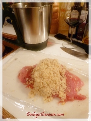 Make a stuffing with some bread, shallots or onions, garlic, herbs such as rosemary or thyme, salt and pepper. Chop a few seconds in your Thermomix on Speed 5 or 6 until you get the consistency you want: rough chopped or finely grated.
