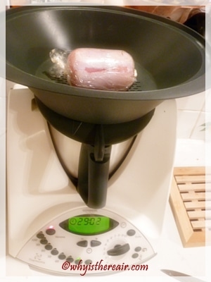 Add about a litre of water and up to a tablespoon of salt to your Thermomix bowl. Insert the internal steamer basket and put the lid on. Place your roulade into the Varoma steamer and place the Varoma on top of your Thermomix. Steam on Varoma setting/30 minutes/Speed 2. During this time, check your braised legs, slice and sauté your mushrooms, reduce your sauce and finish it with butter. Oh, and you’ll probably have time to set the table and pour a couple of glasses of wine while Thermomix cooks your dinner 😉